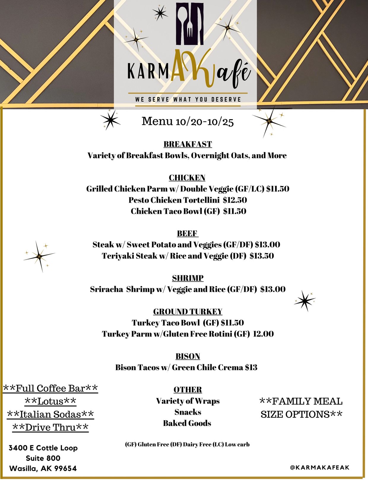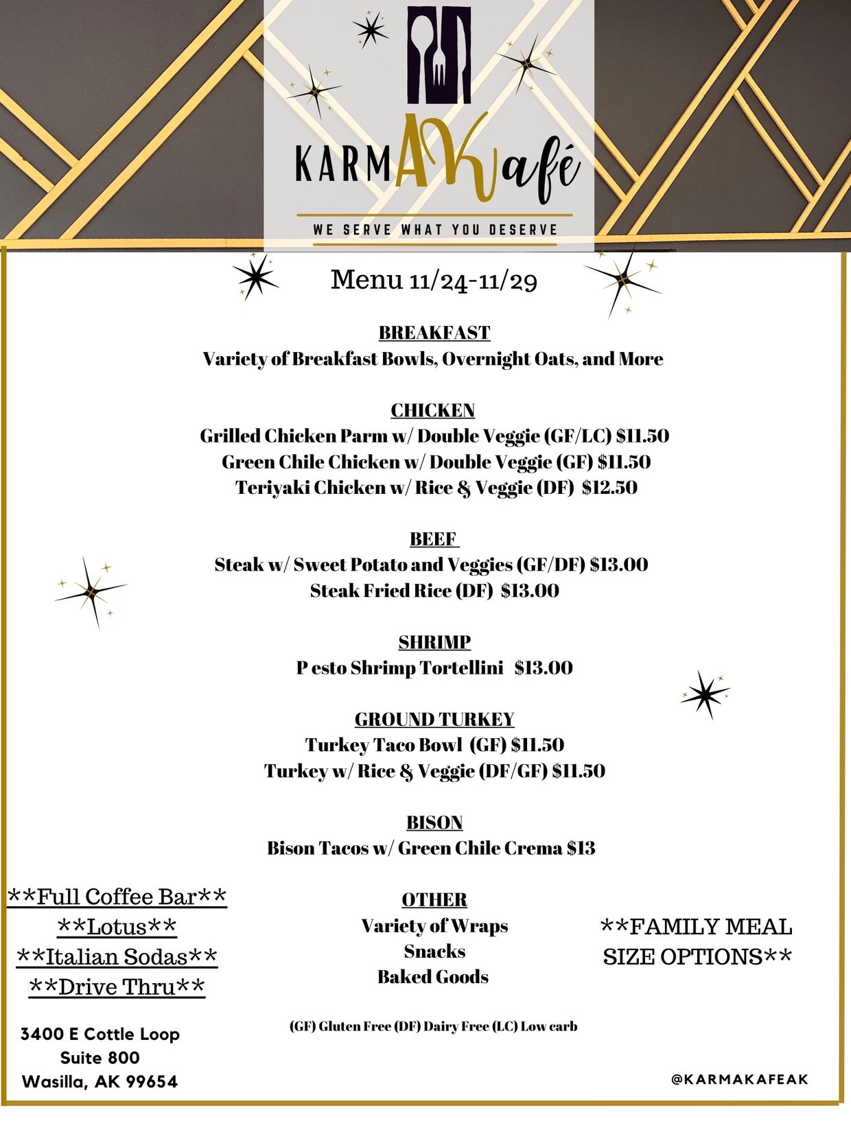 At Karma Kafé, we love to provide options, we update and change our menu weekly.
